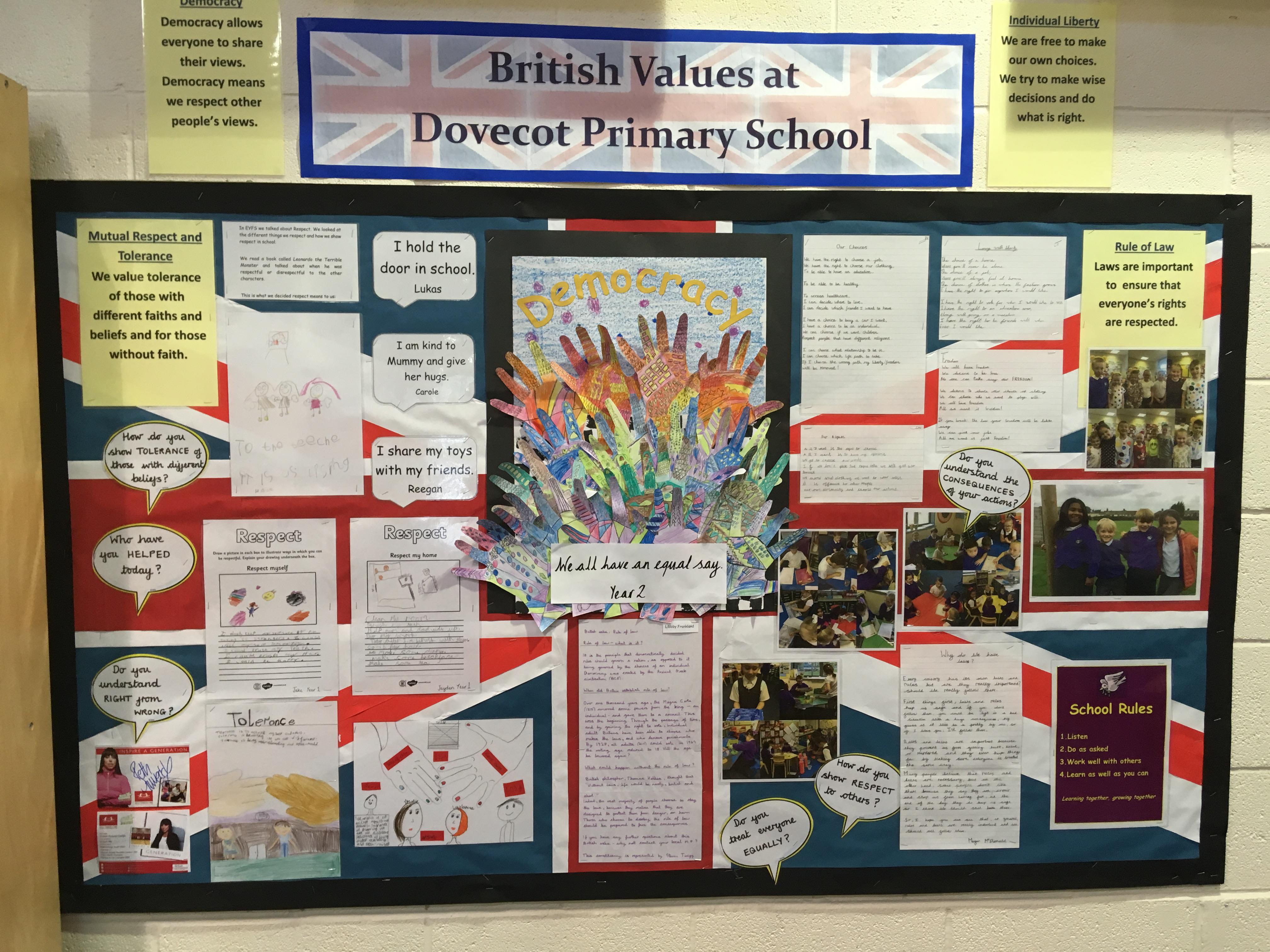 At Dovecot Primary School we take very seriously our responsibility to prepare children for life in modern Britain. We ensure that the fundamental British Values are introduced, discussed and lived out through the ethos and work of the school. All curriculum areas provide a vehicle for furthering understanding of these concepts and, in particular, our RE (Religious Education), PSHE (Personal, Social and Health Education) and SEAL (Social and Emotional Aspects of Learning) lessons provide excellent opportunities to deepen and develop understanding. Children embrace these concepts with enthusiasm and demonstrate a good understanding of their application to their own lives.