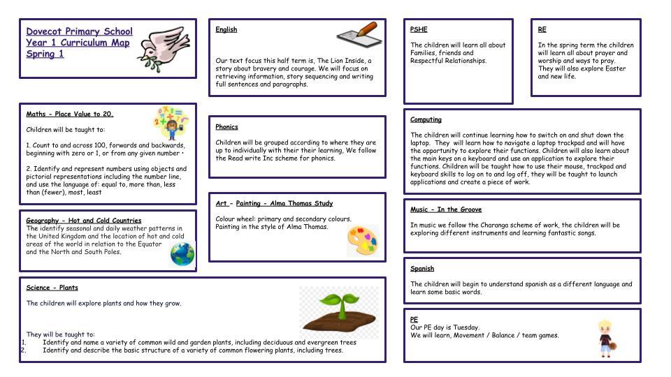 In year 1 we begin to follow the National Curriculum.  As well as the CORE subjects Maths, English, Phonics and Science, the children are taught lessons in History, Geography, Computing, Spanish, Art, Design and Technology, Music, PE, RE and PSHE.  See the National Curriculum document for more information.
